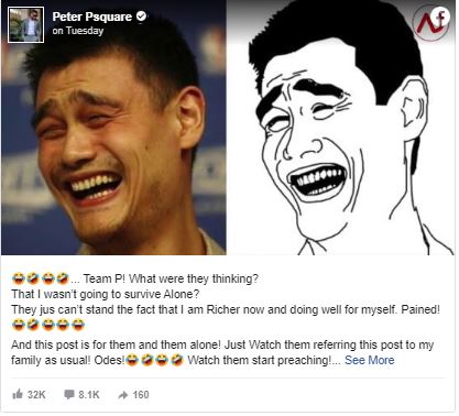 “Team P! What were they thinking? That I wasn’t going to survive Alone? They just can’t stand the fact that I am Richer now and doing well for myself. Pained! And this post is for them and them alone! Just Watch them referring this post to my family as usual! Odes! Watch them start preaching!” he wrote.