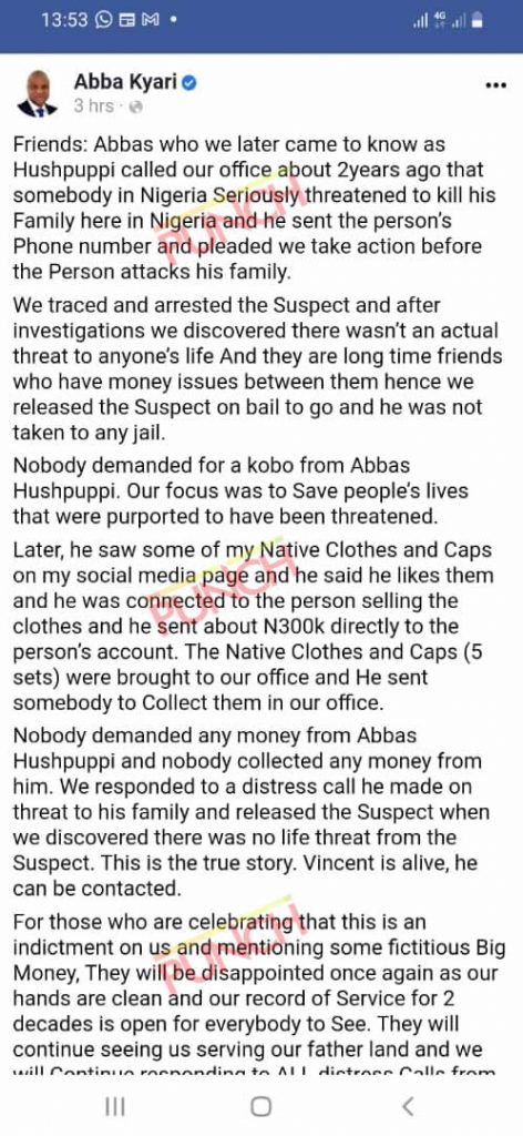The cop had also added, “Nobody demanded a kobo from Abbas Hushpuppi. Our focus was to save people’s lives that were purported to have been threatened.